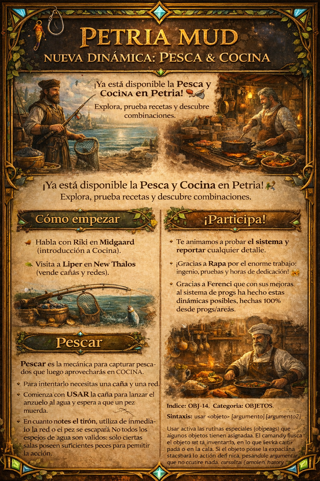 Noticias y Cambios Ayudas Inventario Mapas Loot Bulders ¡Algo Épico esta por comenzar! ¡Bienvenido a la aventura! Petria es un juego de rol multijugador en línea estilo D&D y RPG que esta ambientado en un reino fantástico lleno de magia, criaturas místicas y aventuras sin fin que funciona solo con texto y tu imaginación. ¡Aprender a jugar!Aprende paso a paso como jugar en este reino lleno de aventura y diversión. ¡Atrevete a vivir la experiencia! ¡Atrévete! ¿Chateamos? Pesca y CocinaLos héroes arrancan tesoros del agua y los transforman en banquetes que te dan poder. Conoce más War of Flag en PetriaWoF Petria es la arena de leyenda donde héroes luchan por estandartes y gloria. Conoce más Descubre los OficiosLos Oficios te permiten progresar incluso sin estar conectado. ¡Forja tu legado! Conoce más Novedad en Petria ¡Evento especial de año nuevo! Los Oficios: El Tiempo del Probador Conoce más Códice del ReinoGuías, videotutoriales y descargas oficiales para adentrarte en Petria y escribir tu historia desde el primer paso. Conoce más Conoce las Clases y RazasManual para jugar: En Petria, cada raza y clase define tu destino. Conócelas y elige tu camino. Manual