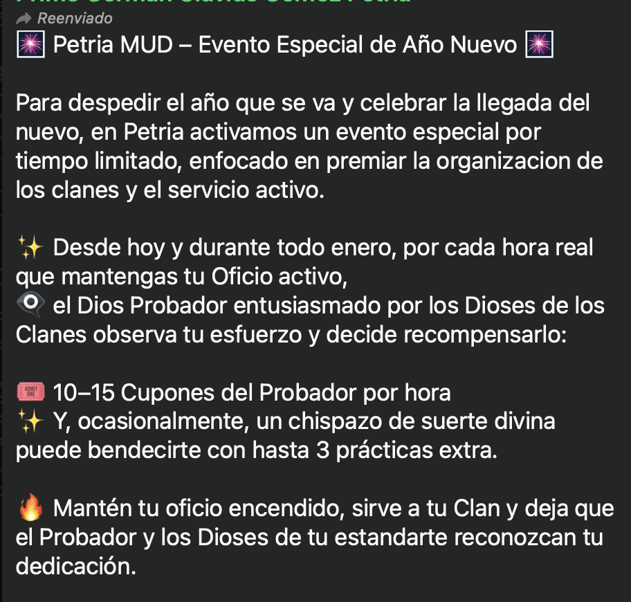 Noticias y Cambios Ayudas Inventario Mapas Loot Bulders ¡Algo Épico esta por comenzar! ¡Bienvenido a la aventura! Petria es un juego de rol multijugador en línea estilo D&D y RPG que esta ambientado en un reino fantástico lleno de magia, criaturas místicas y aventuras sin fin que funciona solo con texto y tu imaginación. ¡Aprender a jugar!Aprende paso a paso como jugar en este reino lleno de aventura y diversión. ¡Atrevete a vivir la experiencia! ¡Atrévete! ¿Chateamos? Clases y RazasManual para jugar: En Petria, cada raza y clase define tu destino. Conócelas y elige tu camino. Conoce más Descubre los OficiosLos Oficios te permiten progresar incluso sin estar conectado. ¡Forja tu legado! Conoce más Novedad en Petria ¡Evento especial de año nuevo! Los Oficios: El Tiempo del Probador Conoce más Códice del ReinoGuías, videotutoriales y descargas oficiales para adentrarte en Petria y escribir tu historia desde el primer paso. Conoce más
