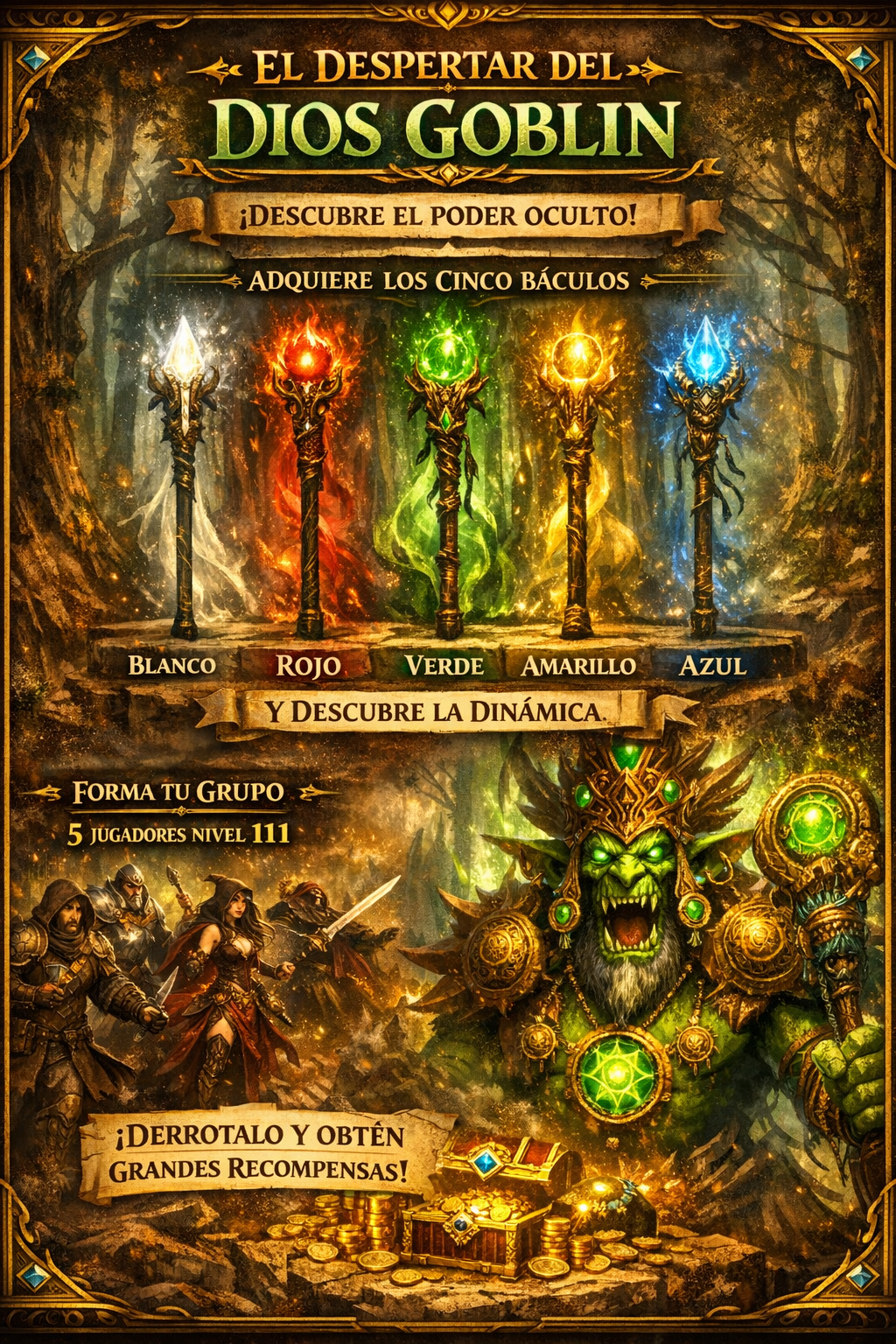 Tendrás que hacer un grupo compuesto por 5 personajes en nivel 111 para derrotar a este poderosísimo Dios, pero no te preocupes, la recompensa valdrá la pena
