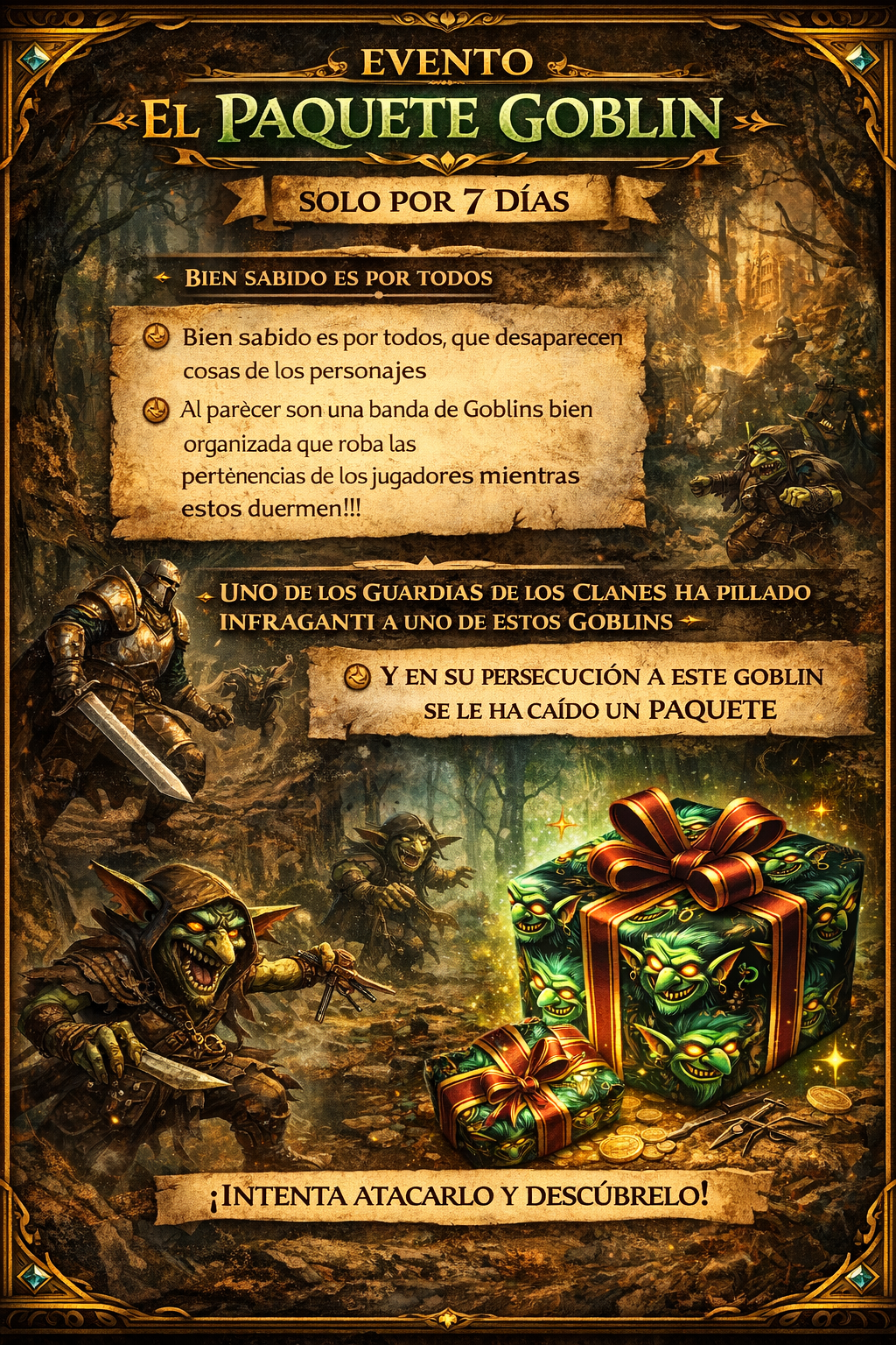 Uno de los guardias de la ciudad de los Clanes ha pillado infraganti a un Goblin y en su persecución se le ha caído un paquete al suelo. ¿Qué habrá en su interior? ¡Descúbrelo!